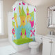 A cute, colourful, whimsical shower curtain for girls who love fairy tales and princesses featuring a blonde haired princess turning a green frog into her prince with a magic wand, a castle, flowers, and a butterfly.