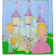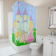 A cute and colourful shower curtain for the little princess features a royal castle, princess with blonde hair and a pretty purple polka dotted dress, a prince with crown, sword, and shield, and a polka dotted dragon!