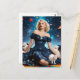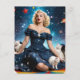 A vintage looking blonde woman in a dress with stars all over it and three white cats floating in the stars fantasy AI generated art