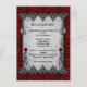 This 'Blood Roses and Silk Red Gothic Wedding' reception enclosure card is a very opulent invitation indeed, which features a lush, rippling red silk-look background, with a grey antique parchment-look paper on top. Along the top and bottom of the parchment are grey and black gothic jewels decorating the edges, with pairs of creepy little silver skulls on chains hanging off the corners. There are red roses along the side with black lace ribbon to finish off the spooky, gothic feel of this enclosure card. The reverse of the card features the grey parchment-look again, with a larger version of the blood red rose and lace. A decorative, yet practical way to let your wedding guests know all the important details of what is sure to be your fabulous gothic wedding reception!