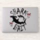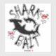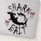 Surf style shark bait stickers with a black silhouette of a Hammerhead Shark swimming in the ocean, circling looking for food, with red splashes of blood in the water.