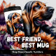 A dignified Bloodhound with a soft expression and its tongue slightly out is peacefully situated amongst a beautiful arrangement of warm-toned sunflowers and large purple peonies. Subtle watercolor splatters in the background add an artistic and calming touch to this gentle canine portrait.