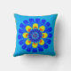 An intricate petaled flower in shades of blue, orange, purple and yellow adorn this happy throw pillow.