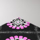 A fluffy flower with multiple layers of petals in shades of black, grey, white and pink.