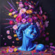 "Bloom of Eternity" – A Colourful Surreal Portrait. This piece fuses the permanence of sculpture with the fleeting vibrancy of flowers, creating a visual dialogue between stillness and growth. The serene blue figure appears timeless, yet crowned with an explosion of radiant blossoms that seem to pulse with life, symbolising rebirth, creativity, and the enduring cycles of beauty found in both nature and art.