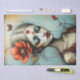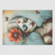 A captivating tissue paper design for decoupage, featuring an ethereal and melancholic female figure entwined with nature. Her pale, porcelain-like face is framed by flowing silver hair adorned with a bold red poppy flower and delicate floral details. Soft, smoky blue eyeshadow and deep red lips create a dramatic contrast, evoking an otherworldly beauty. Branches and flowers seem to grow from her skin, symbolising a connection between humanity and nature. A vibrant butterfly flutters in the background, adding life to the serene yet haunting composition, with muted teal and warm earthy tones completing the atmosphere. Perfect for projects inspired by fantasy, gothic elegance, and nature's mystique