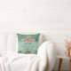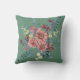 "Bloom where you are Planted" is the message on the front of this pretty inspirational pillow. The message is at the centre of a light green banner that is bordered in soft pink, cream and blue flowers, with a touch of crimson and gold. The image is placed on a medium teal green background. The back of the pillow has a second floral bouquet image, without the text.