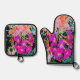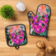 This Beautiful Floral Oven Mitt and Pot Holder Set features Abstract Magenta and Orange Blooming Garden Flowers with Hot Pink, Purple, Coral, Lime Green, Black and Pink Accents. The result is a cool, colourful flower garden painting that you will love!