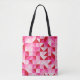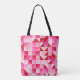 This image is a bright, abstract geometric pattern composed of triangles and chevron-like shapes in various shades of pink, blush, and red arranged in a repeated grid. The design creates a dynamic, vibrant, and playful effect, reminiscent of a fabric quilt or a puzzle made of colour blocks. Each tile combines light and dark tones, forming a sense of movement and symmetry across the canvas.