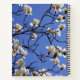Design features a beautiful image of white magnolia flowers in bloom against a sky-blue background.