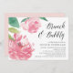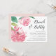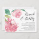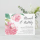 Chic bridal shower brunch invitation features watercolor peony flower illustrations in vibrant pink, accented with lush green leaves. Personalise with your bridal brunch details aligned at the right, topped with "brunch & bubbly" in elegant calligraphy script. Cards reverse to solid blush pink.