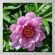 A close-up of a large pink peony in full bloom. The vibrant petals and lush green leaves create a striking contrast.
