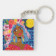 A vibrant and joyful portrait celebrating beauty, nature, and feminine energy. This colourful artwork features a woman with flowing blue and pink hair adorned with bright tropical flowers, set against a dreamy blue background with a radiant yellow sun. A scuffed paper effects adds to the charm. Personalise with a name.
