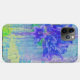 This phone case flaunts a digital collage made up of several layers of scans of photographs, paintings and textures. A cluster of blue violet flowers sits on an abstract background in shades of lavender, green, purple and shades of blue.