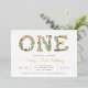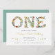 Blooming floral invitation for your little girl's first birthday features "ONE" spelled out in chic flowers, with your party details beneath in gold foil and grey lettering. Shimmering gold foil accents on the flowers add a delightful touch to this charming nature inspired design.