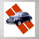 Digitally reworked image of 41 Chevy coupe street rod placed before two large red diagonal stripes.