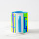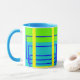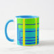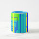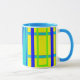 This pretty and bright mug features my original graphic art of lines and shapes in blue, yellow and green tones. It has an abstract style and is reminiscent of the retro Mondrian era of art. The inside and handle have a harmonising tone of aqua blue.