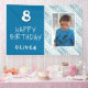 Blue Abstract Wave Boy Photo Happy Birthday Banner. The design has blue and white waves, blue background, fun text happy birthday and name. Add your photo and your name. Great for a boy`s birthday party.
