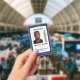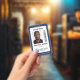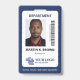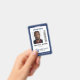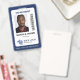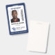 Professional vertical ID badge with your photo on white with a dark blue border. Add your logo, name, and title and a bar code.
