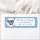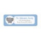 Cute elephant address labels, exclusively designed by Artistically Invited, with an adorable grey elephant in a white circle with your personalised name and address in blue and grey in a white rounded rectangle, over a blue background colour. The family or individual's name is printed in blue above the address which is printed in grey.