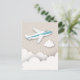 A birthday postcard invitation featuring an illustration of an aeroplane with a blue stripe flying in the clouds. Personalise all text.