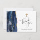 This elegant modern First Communion thank you card features a blue watercolor agate border trimmed with faux gold glitter. A small gold faux foil cross appears over the words "Thank You" in charcoal grey handwriting script on a white background. The customisable text includes your child's name on the front and an editable message on the back in italics.