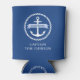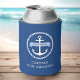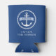 Can cooler featuring a white nautical anchor surrounded by a rope border on a dark blue background. Across the anchor is a light blue ribbon with a template field for your boat's name. Below is a template field for more custom text for example the captains name.