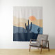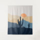 Mexican desert at sunrise illustration with sun, mountains and cactus decoration in navy blue, orange, blue and beige colours on pastel grey background