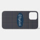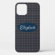 Phone case featuring a blue and beige plaid pattern with a blue oval that you can customise with your name.