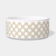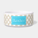 Cute and chic white polka dots pattern on a beige background colour. There is also a customisable text area for your pet's name on a blue background.
