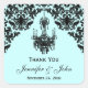 This 1.5" square aqua blue and black damask chandelier wedding favour thank you sticker and/or envelope seal matches the wedding invitation shown below. There is also matching envelopes and postage to allow you to mail out a beautifully coordinated invitation. You can change the text to say whatever you want, and you can also change the sticker size to 3" and adorn your wedding/party favours with. If you require any other matching items in this design, please email your request to niteowlstudio@gmail.com.