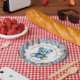 Blue and brown yarn crocheted teddy bear. it's a boy baby shower small cake paper plates. Adorable trendy theme for a sweet boy's baby shower.