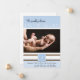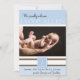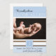 This precious baby announcement design is a wonderful way to celebrate your new arrival. This design has a light blue background blocked with white and brown stripes. In the centre is a place for your personalised photo of your son. At the top it says We proudly welcome and your baby's name. Below the photo there is a place for his first initial monogram. To the bottom, there is a place for your baby's name, and birth statistics, and the parent's names.