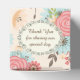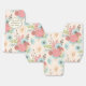 Elegant wedding favour box done in a blue, coral, brown, and green on ivory floral pattern. A decorative oval plaque, on the lid of the box, has custom brown text ready to personalise. Lovely little gift box for candies and anything else you want to give your guests.