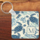 This beautiful monogrammed keychain features a coastal inspired pattern of sea turtles and coral in shades of blue and cream. Personalise the monogram with your choice of initial on the front and contact information on the back.