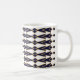 This mug has an art deco design of triangles and diamonds that look like bowties in blue and gold.
