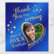 Create unique royal blue and gold Thank You bottle labels for the 2026 Graduation party or for favours with an elegant design that features a heart shaped photo, the Graduate's name, and year. Use the template to type your Grad's name and year and upload a picture before ordering.