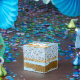 Chic wedding or special occasion favour gift box, with graphics of a blue and gold foil and glitter looking abstract striped look. A gold and white decorative plaque, on the lid of the box, has custom text ready to personalise for your event.