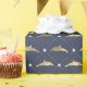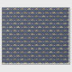Blue and gold nautical pattern gift wrap featuring dolphins in a lattice pattern.