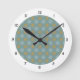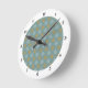 This clock features a repeating tiled pattern in soft blues and gold by artist Jayne Wilson.