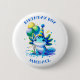 Blue and green Axolotl themed boy's birthday party personalised birthday boy button. A cute axolotl in a birthday hat with balloons.