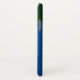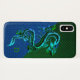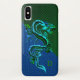 Colourful fantasy themed iPhone X case done in a green on green gradient pattern, on the upper part of the case and a gradient blue pattern, on the lower part. Graphics artwork of a blue and green Chinese style dragon, decorates the middle of the case. Personalise the green one letter monogram to suit your needs.
