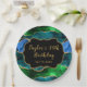 This elegant and glamourous birthday party plate features a blue and green agate marble background with faux gold glitter accents. The text combines handwritten script and modern sans serif fonts for a classy and sophisticated look. The sequins and distressed texture creates the perfect blend of chic and grunge.