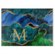 This cutting board features an elegant and glamourous blue and green agate marble background with faux gold glitter accents. The monogram combines handwritten script and modern sans serif fonts for a classy and sophisticated look. This will make the ideal gift as it can be customised with a name and initial. The sequins and distressed texture creates the perfect blend of chic and grunge.
