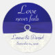 ****PLEASE NOTE that the ribbon and jewels are printed images, and are not real. This 1.5" round blue and ivory damask "Love never fails" sticker/envelope seal matches the items shown below. There are other shapes and sizes you can choose, including sizes for on your wedding favours. If you need assistance, email niteowlstudio@gmail.com.