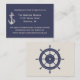 Nautical themed wedding enclosure reception information card done in blue and ivory, with vintage artwork of a ship's anchor, on the front and a ship's steering wheel, on the back. Ivory text, on the front, is ready to personalise for your wedding. Matching nautical themed wedding products are available.