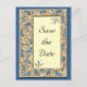 A Save the Date postcard with a beautiful Victorian illustration with elegant floating feathers in blue and cream on a tan and blue background. Click Customise It to change fonts, sizing and more, even save your design for later.