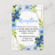 This fun and whimsical wedding reception enclosure card features watercolor baby blue and navy blue flowers with foliage on a gold geometric frame. The text combines handwritten script and serif fonts for a stylish and modern look. This is perfect for a spring or summer rustic wedding.