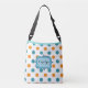 Allover print tote bag with a strip of blue and white diagonal stripes on top and lots of blue and orange polka dots on white with a blue decorative banner that you can customise easily with a name.