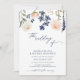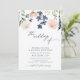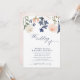 Peach and blue floral wedding invitation: This beautiful natural garden wedding invitation features a watercolor drop at the top with peach and dark blue flowers and green leaves. Paired with a flowing handwritten style script and a clean sans serif font, this wedding invitation is sure to impress all of your guests! The back features a garden wreath with room for your wedding website info. You can delete this or add to this message if you like.